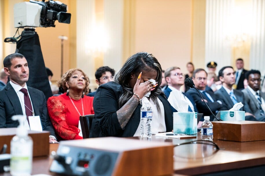 I know a little about the kind of bravery we saw on display at the hearing of the House 1/6 Committee, but I don’t know it the way the witnesses do who testified today. What we saw this afternoon was extraordinary. Four people, each of whom came to do their jobs in different ways, probably for different reasons, were forced to decide between their personal honor and giving into pressure from their colleagues, friends, and people far more powerful than they were. But they came down on the same side, all four of them, standing up for what was right against anger and oppression and the exercise of raw power untethered to reality, morality, or democracy. What they did was brave. Full stop. There is no other way to see it or say it.