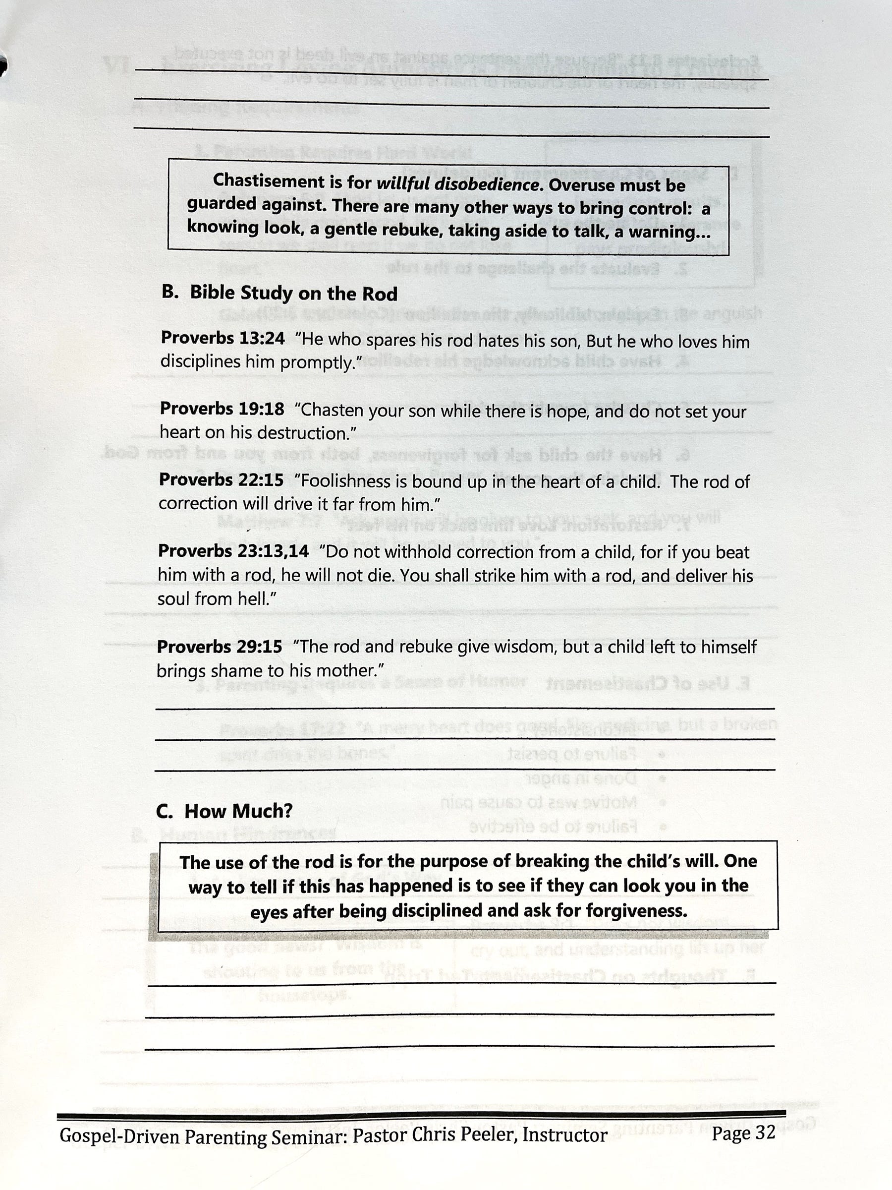 Look at the page depicted above. It’s from a handout called “Gospel-Driven Parenting” distributed by a conservative Christian group run by a minister named Chris Peeler, who is part of a larger Christian home schooling network run by a man called Gary Cox, described by the Post as “an evangelical pastor and pioneer of Maryland’s home-schooling movement.” Here’s what the handout says about beating your child: “The use of the rod is for the purpose of breaking the child’s will. One way to tell if this has happened is to see if they can look you in the eyes after being disciplined and ask for forgiveness.”