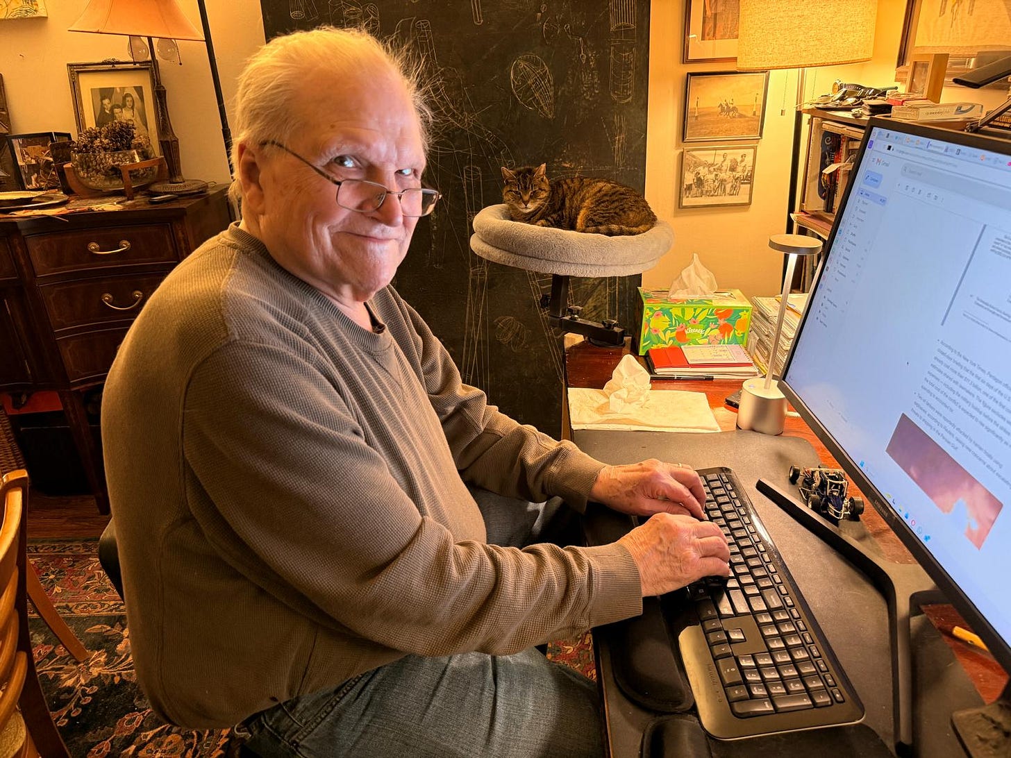 And Little Cat is not out there in the storm. She is watching me doing my reading for tomorrow’s column. For Tracy and me and the rest of the animals, it’s a very good feeling to have her in our family.